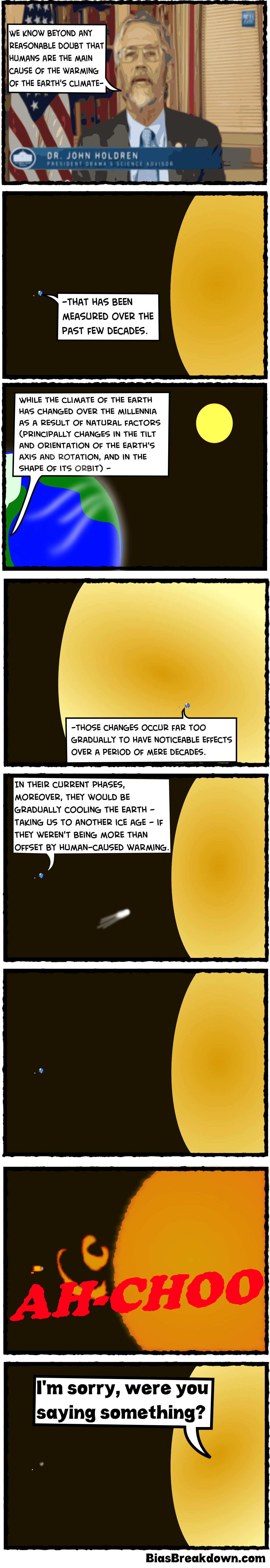 John Holdren says Global Warming Will Save Us From the Next Ice Age. The word bubbles are the actual quotes from National Science Adviser John Holdren’s online Q&A on YouTube. The link is here. Partial transcription is here.