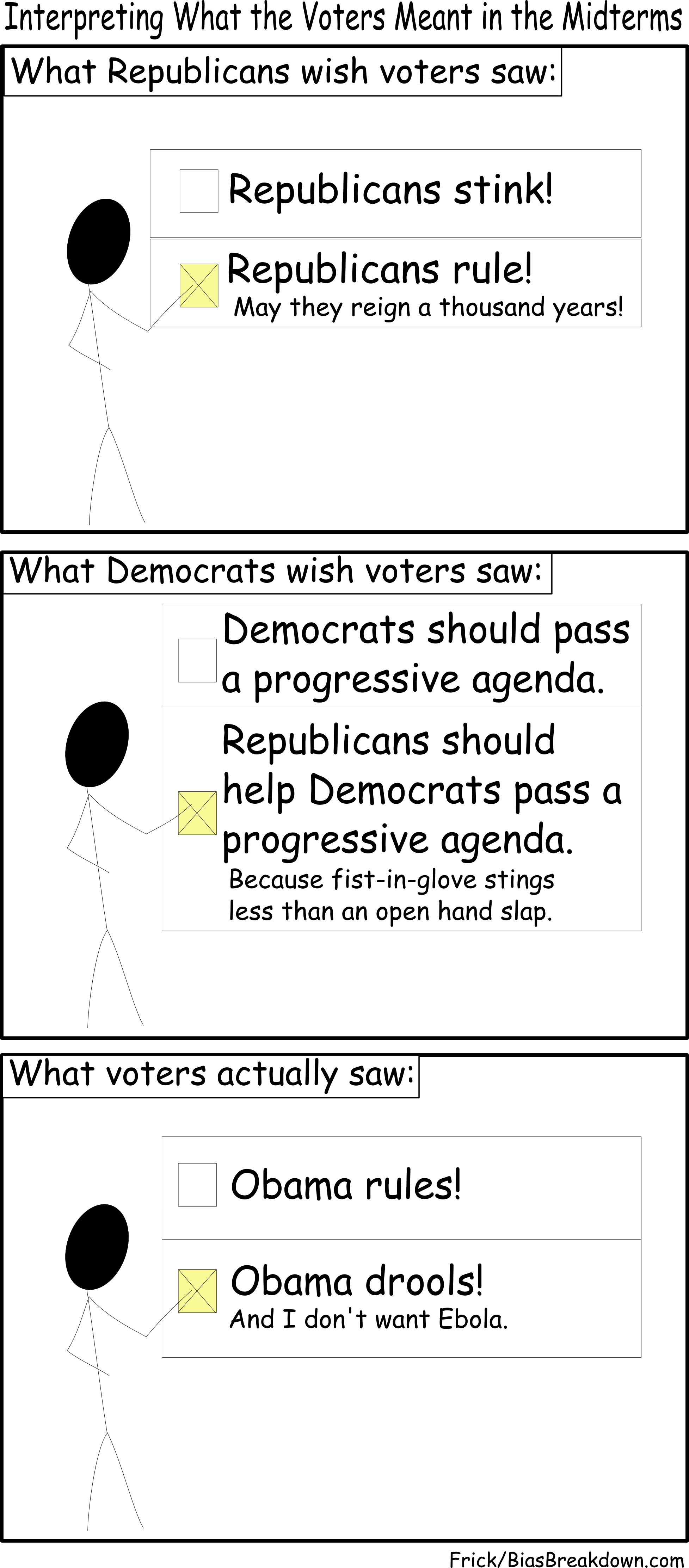 What Voters Meant in the Midterm Elections Posted on 11/05/2014 by frick Reply Spread the word:TweetShare on Tumblr Click to share on Reddit (Opens in new window) Reddit Click to email a link to a friend (Opens in new window) Email Click to print (Opens in new window) Print MorePocketLike Loading...